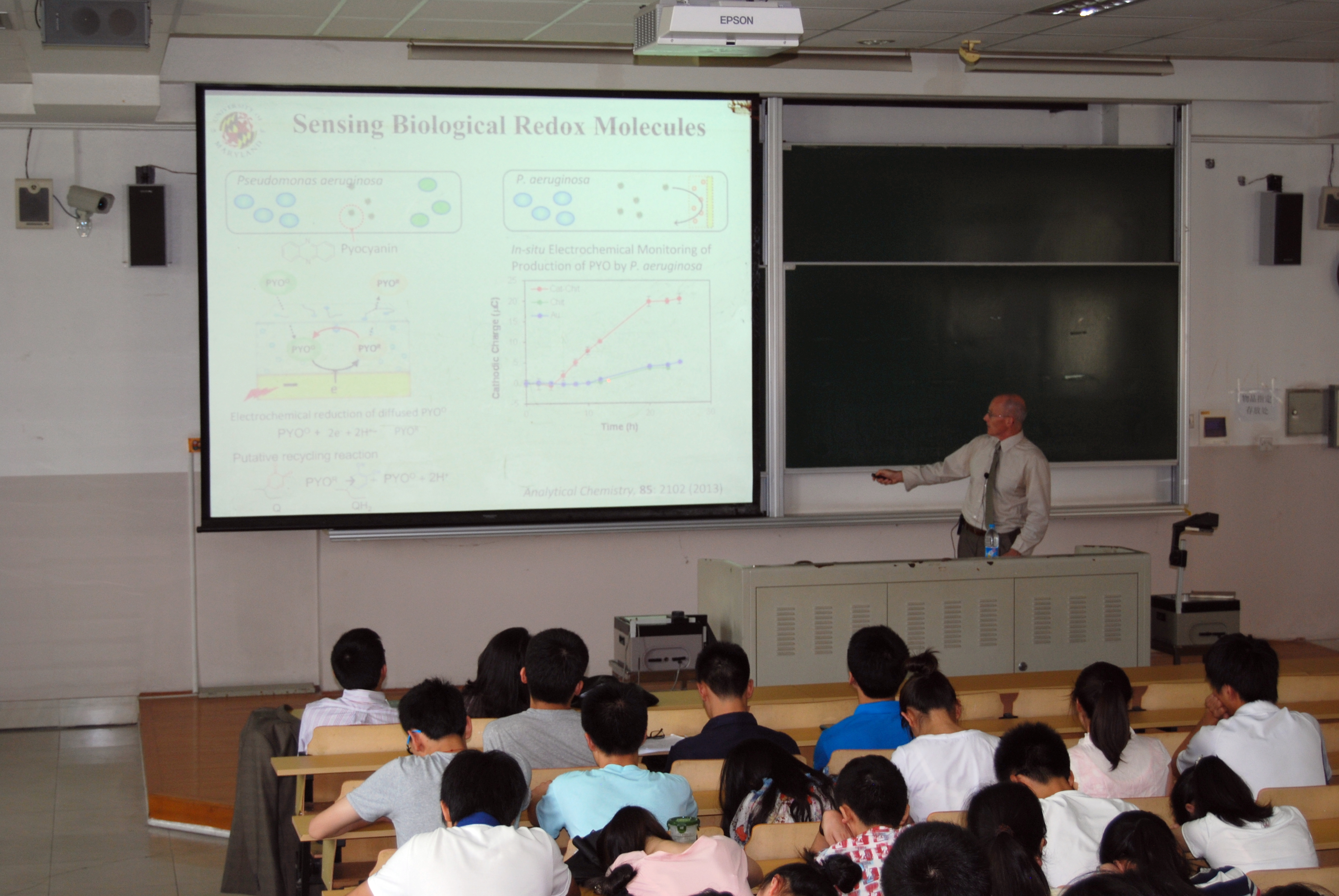 受聘仪式后,Gregory F.Payne教授做了题为“Accessing Biology’s Toolbox for Materials Fabrication”的精彩学术报告。报告中,Gregory F.Payne教授全面生动地介绍了其利用生物酶反应及电极沉积技术进行多糖、蛋白等天然生物材料的自组装及功能开发方面的工作。其新颖的设计思路与突出的研究成果引起了在场师生的广泛兴趣。