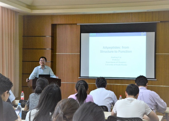 6月15日下午,应澳门十大信誉好的网站刘润辉教授邀请,美国南佛罗里达大学终身教授蔡健峰博士来校访问并作了题为“AApeptides: From Structure to Function”的精彩学术报告。来自澳门十大信誉好的网站和药学院的师生参加了报告会。