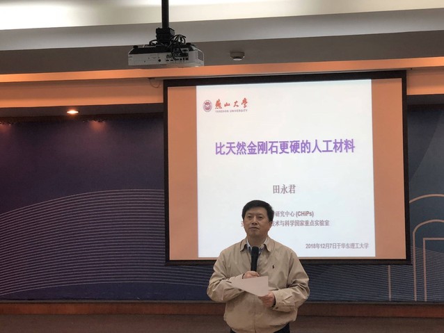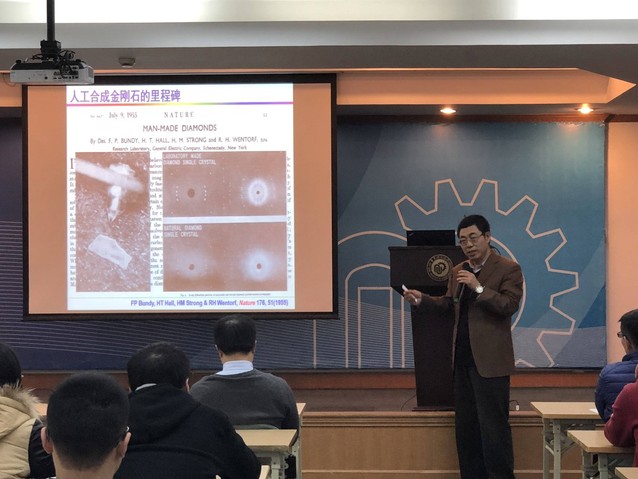 近日,中国科学院院士、燕山大学澳门十大信誉好的网站田永君教授受邀来校访问,并作了题为“比天然金刚石更硬的人工材料”的精彩报告。报告由副校长刘昌胜院士主持,澳门十大信誉好的网站副院长林绍梁教授、李欣欣教授,杨化桂教授等师生百余人参加了报告会。