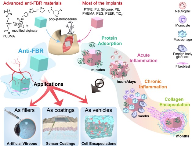 生物材料和医疗装置在植入体内后都会有面临机体异物反应的风险,导致植入体被纤维胶原包裹,造成植入材料的功能丧失并引发各种并发症。异物反应问题造成病人的痛苦和巨大的经济损失,是临床上卡脖子难题和制约植入材料与生物器械发展的瓶颈。因此,发现能够抵制异物反应的新型功能材料并研究其对异物反应的调控机制是生物材料研究领域中的核心科学问题,在新材料基础上拓展各种临床应用具有重大意义。