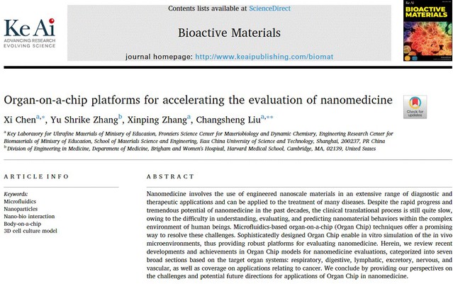 近日,十大信誉官网澳门十大信誉好的网站生物材料研究中心刘昌胜院士/陈曦副教授在《Bioactive Materials》(《生物活性材料》)上发表题为‘Organ-on-a-Chip Platforms for Accelerating the Evaluation of Nanomedicine’的综述文章。