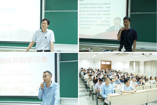 学院党委副书记戴诚安首先为全院教师详细阐述了《新时代高校教师职业行为十项准则》,引导广大教师努力成为有理想信念、有道德情操、有扎实学识、有仁爱之心的“四有”好老师。随后,他带领全体教师共同学习了《教育部关于高校教师师德失范行为处理的指导意见》。他强调,学院要全面加强教师队伍思想政治工作,将师德师风建设要求贯穿教师管理全过程;对教师师德失范行为实行“一票否决”,推进师德师风建设任务落到实处;教师要把教书育人和自我修养结合起来,坚持以德立身、以德立学、以德施教、以德育德。