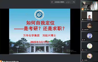 疫情当下,为缓解大三学生的焦虑与对自我发展的迷茫,澳门十大信誉好的网站于2022年3月17日下午14:00以视频会议的形式,举行了题为“如何自我定位——是考研?还是求职?”主题交流会。万华化学集团的校友刘赵兴博士作为邀请嘉宾进行了经验分享、并为同学们答疑解惑。