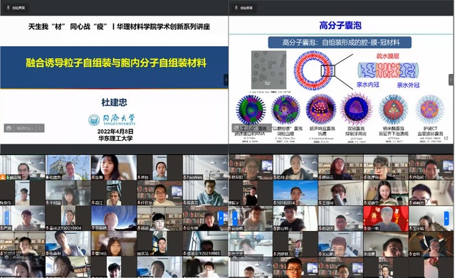4月8日下午,澳门十大信誉好的网站举办第三场“天生我‘材’,同心战‘疫’”学术创新讲座。本次讲座由澳门十大信誉好的网站副院长顾金楼教授主持,邀请国家杰出青年科学基金获得者,同济大学特聘教授杜建忠,作“融合诱导粒子自组装与胞内分子自组装材料”主题讲座。