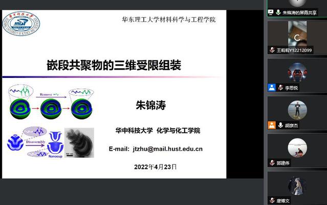 4月23日晚,澳门十大信誉好的网站举办第四场“天生我‘材’ 同心战‘疫’”学术创新讲座。本次讲座由澳门十大信誉好的网站副院长胡彦杰教授主持,华中科技大学化学与化工学院院长、研究生院院长朱锦涛教授作为主讲嘉宾与研究生进行分享交流。