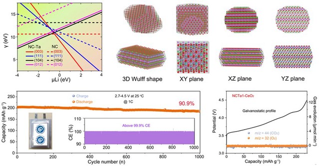 在前期工作中,该团队提出表面限域辅助沉积以及高温强化扩散共改性策略,原位实现了高镍氧化物正极材料铝离子梯度掺杂和快离子导体偏铝酸锂均匀包覆,明确了铝的掺杂位点,有效稳定晶体结构和电极-电解液界面,循环稳定性超过1000次,与商用石墨负极组装成3.5Ah单体软包和18650型圆柱电池,通过了国家动力电池创新中心检测测试中心的加热和挤压等试验(Nature Common. 2021, 12: 4564)。为了进一步解决高工作电压下晶格氧电荷损失和氧化析出等问题, 该团队研究人员发展了异质元素掺杂并诱导一次颗粒取向生长和定向排列成序构化的高镍正极材料新策略,从根本上解决二次颗粒结构不稳定难题;在此基础上,利用氧化铈可逆储氧特性,有效抑制了氧流失,并将工作电压提升到4.5V。研究人员通过第一性原理计算、有限元模拟、原位X射线衍射、原位微分电化学质谱和同步辐射X射线吸收谱等先进的理论和表征手段对高镍正极材料晶格氧调控机制进行了详细的表征和梳理。所制备高镍正极材料的比电容量高达231.3 mAh g-1,首次库伦效率为93.5%,与商用石墨负极组装成的软包全电池在2.7-4.5 V的宽电压范围内循环1000圈后容量仅衰减9.1%(Natl. Sci. Rev. DOI: 10.1093/nsr/nwac166)。