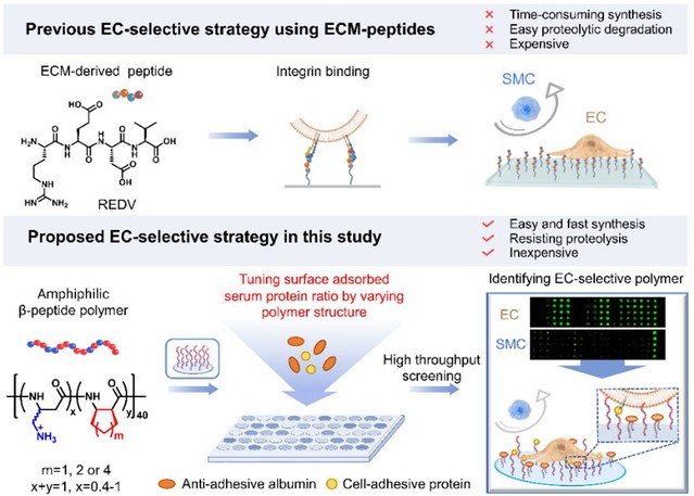 血管内皮层作为血管的内部屏障,在许多生理和病理过程中发挥着关键的作用。然而,人工血管和血管支架植入等造成的内皮层损伤会导致平滑肌细胞的过度增殖、血小板活化等问题,最终引发内膜增生及血栓形成。因此,选择性促进内皮细胞生长和促快速内皮化是维持血管长期通畅的最有效策略之一。目前,只有种类极为有限的细胞外基质(ECM)多肽(REDV和YIGSR)常被用于促进生物材料内皮化的活性成分。然而,这些多肽容易被酶解、体内稳定性和功能持效性差、价格昂贵且难以大量制备,限制了其实际应用。本研究设计和发现了一种新的聚合物策略,实现了对内皮细胞显著的选择性和优异的促快速内皮化功能。此外,β-多肽聚合物通过一锅法聚合制备,具有优异的抗蛋白酶水解能力和稳定性,相对于多肽具有价格低廉且易于大批量合成等优点,能够针对性的有效克服ECM多肽的关键缺点,对血管内皮化的研究和相关应用具有重要意义。