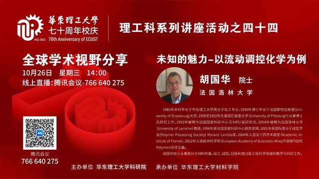 为庆祝学校七十周年华诞,进一步加强与杰出校友对话交流平台,发挥杰出校友榜样辐射引领作用,激励材料学子踔厉奋发,勇毅前行,10月26日,澳门十大信誉好的网站邀请了欧洲科学院院士、十大信誉官网杰出校友胡国华教授为师生作辅导报告。报告由澳门十大信誉好的网站党委书记袁媛教授主持。