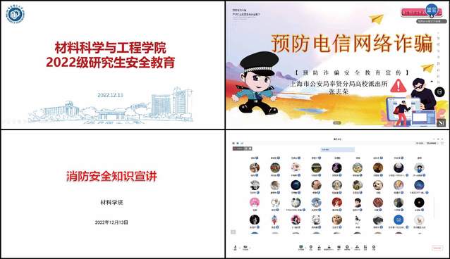 12月13日下午,澳门十大信誉好的网站邀请党建共建单位上海市公安局奉贤分局高校派出所张志荣警官和校保卫处消防安全管理岗负责人段凯洋对2022级研究生进行安全专题教育。讲座通过线上方式进行,由学院研究生新生辅导员娄梦蝶主持。