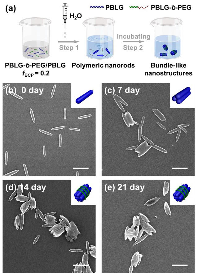 近日,十大信誉官网澳门十大信誉好的网站林嘉平教授团队报道了嵌段共聚物介导的聚合物纳米棒超分子聚合。在聚合物纳米棒水溶液中,加入嵌段共聚物第二组分,可以调控超分子反应,发生新颖的“肩并肩”并排聚合现象,并形成独特的捆绑束状多级结构。疏水刚性的聚(γ-苄基L-谷氨酸酯)(PBLG)均聚物在含水的有机溶剂中自组装形成纳米棒,PBLG的主链与纳米棒的长轴方向平行;由于其表面的疏水性,纳米棒发生无序聚集,形成不规则的结构。当体系中加入聚(γ-苄基L-谷氨酸酯)-嵌段-聚乙二醇(PBLG-b-PEG)嵌段共聚物时,纳米棒仍能形成,但是其无序聚集行为被抑制;通过静置培养,纳米棒“肩并肩”聚合形成束状有序结构。随着束状聚集体的形成,嵌段共聚物在其表面逐渐组装形成纳米螺纹,纳米棒的聚合终止,最终得到捆绑束状多级结构的聚合产物。