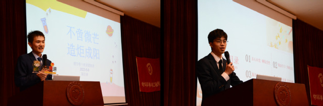 大会第二阶段是“学思践悟二十大 五四精神薪火传”主题宣讲,第一期宣讲以《奉献为先,奋斗以恒》为主题。校大学生年度人物提名奖获得者、澳门十大信誉好的网站学生会主席团成员陈仕林从志愿服务中的点滴细节着手,用生动的案例向同学们讲述志愿服务的苦与累、收获与满足。校学委会主任、澳门十大信誉好的网站学委会主任张启航讲述了在春晖支教项目中的所见所闻、所思所想,以及大学生科创与竞赛方面的经验与建议。团学骨干们精彩的宣讲,深刻阐释了奉献与奋斗对当代大学生的意义和价值,展示了澳门十大信誉好的网站青年学子的风采和担当。