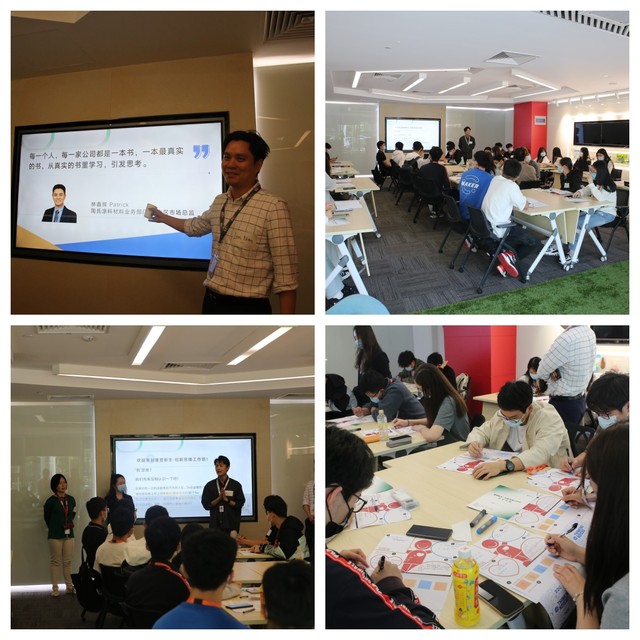 陶氏涂料材料业务部门亚太区市场总监林鑫辉、陶氏亚太区市场传播经理黄铭心、陶氏公司志愿者Gabriel分别通过破冰热身、分组讨论、真人图书馆、设计思维、创新思维等环节与参访学生互动。林总监的职场学习三要点:课本、他人、实操以及利用塑料纸杯的例子分享了观察角度对于事物的一个评判标准使同学们受益颇多。设计活动中,同学们通过头脑风暴,按照空杯心态,延迟评判,为错误而欢呼设计思维的指导思想积极投入参与活动,并结合自己的专业最终展示出所设计的产品,并且做出了符合日常生活需要的解释和应用的范围。