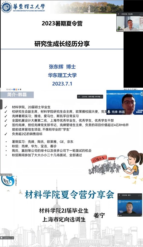 优秀校友分享会环节,特聘副研究员、上海市扬帆计划获得者张东辉,原校研究生会副主席、现就职壳牌(中国)有限公司韩磊、原澳门十大信誉好的网站研究生会主席姜宁结合自身在华理工作和学习经历,与营员们分享了导师选择、科研攻克、实习就业等方面的心得与体会,加深了营员们对攻读澳门十大信誉好的网站研究生的浓厚兴趣。