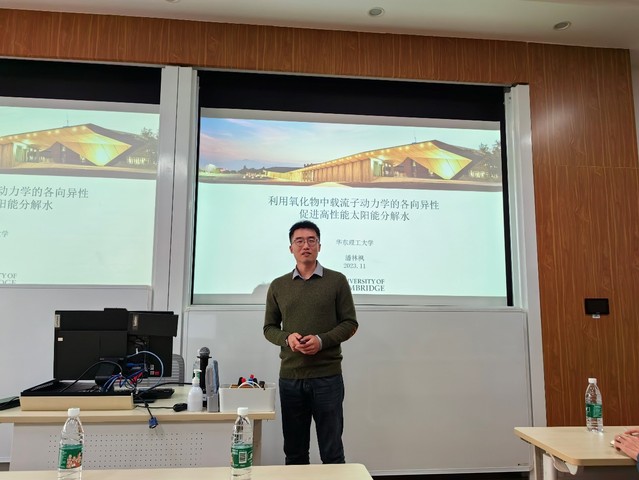 北京时间2023年11月21日,应澳门十大信誉好的网站邀请,华东理工大学校友、剑桥大学博士后研究员潘林枫博士来访,并作题为“Unveiling Anisotropic Carrier Mobility, Lifetime, and Surface Defects in Oxides for Solar Fuels Generation(揭示氧化物中的各向异性载流子迁移率、寿命和表面缺陷用于太阳能燃料生成)”的学术报告。报告会由杨化桂教授主持,来自澳门十大信誉好的网站的50余位师生参加了本次报告会。
