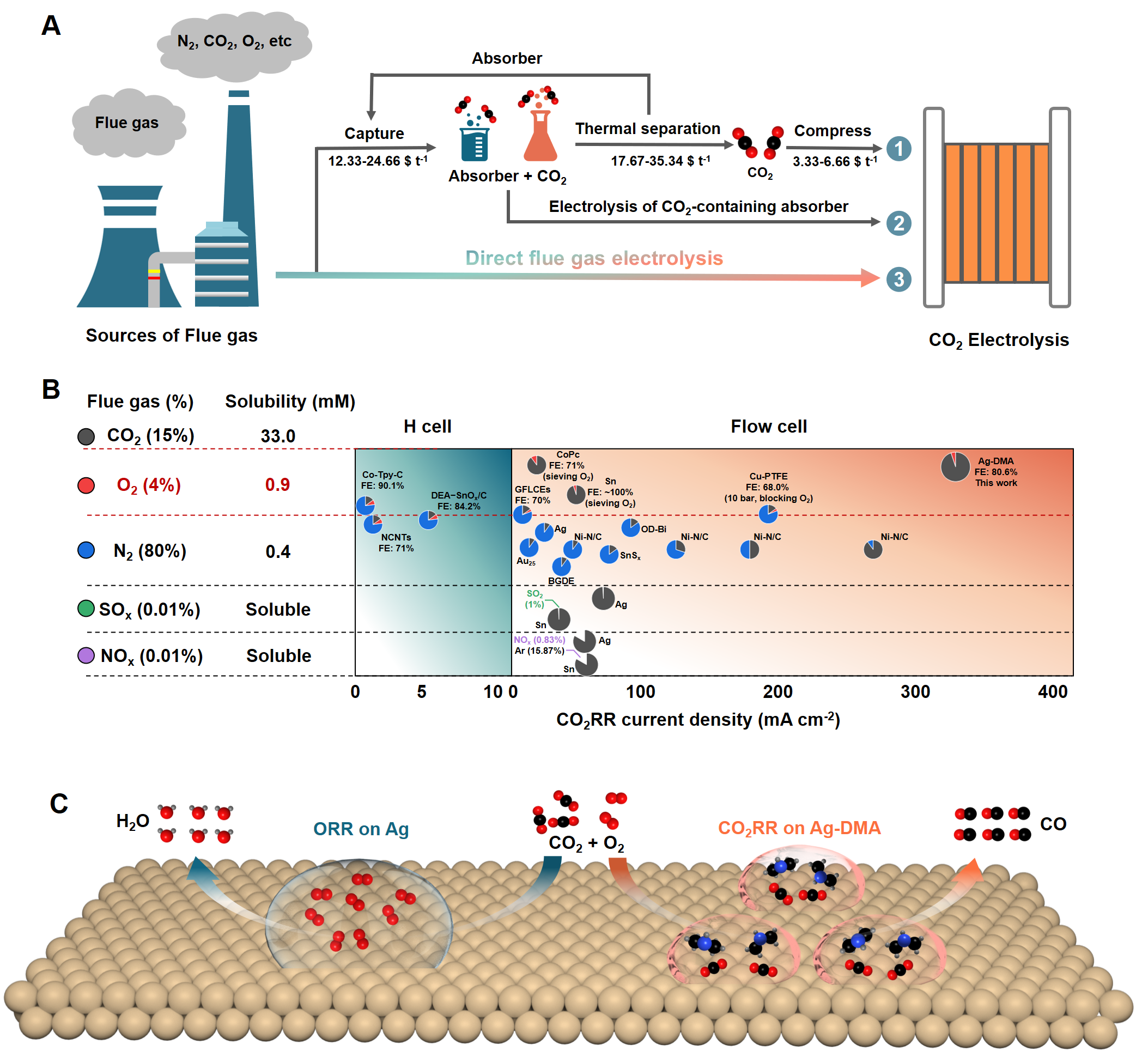 工业中获取纯CO2的主要方法是直接空气捕获(DAC)或从烟道气中进行CO2的捕获和利用(CCU)。不论是DAC还是CCU,两者都需要考虑昂贵的捕获和提纯成本,无法在工业中应用。最近有研究实现了CO2捕获溶液的直接电解,减少了CO2的净化过程。然而,由于传质速度慢、CO2的局部浓度低等问题,实现高产物选择性和反应速率仍十分困难。相比之下,直接电解工业烟道气生产含碳化学品或燃料,对于CO2的直接捕集和原位转化具有重要意义。