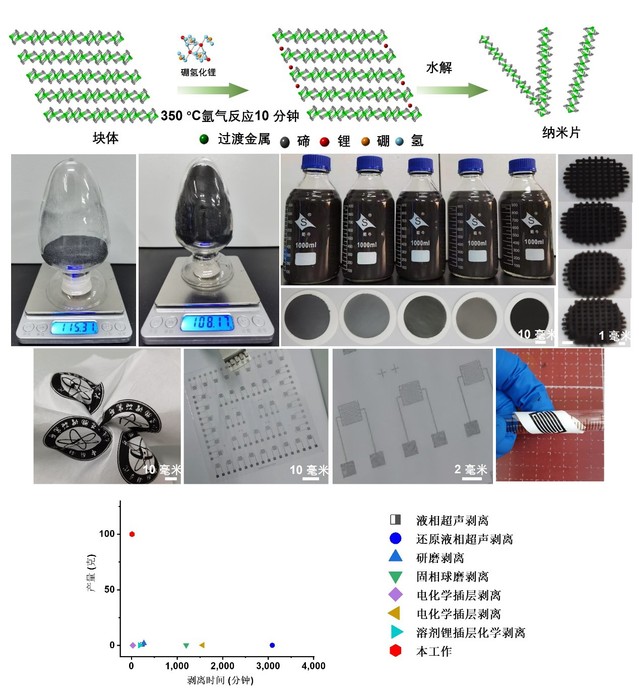 二维过渡金属碲化物材料一般采用“自上而下”的制备方法,如同拆解积木,通过机械力或化学作用方式将其一层一层剥离下来,从而制备出单层的二维纳米片。常用的“自上而下”方法有化学插层剥离法、球磨法、胶带剥离法、液相超声法等,其中,化学插层剥离法剥离效率虽然最高,但剥离仍需要数小时。此前,科学家们大多采用有机锂试剂作为插层剂,即将含有锂离子的插层剂插入块体层状结构材料的片层中,并利用锂和水的反应使插层剂“膨胀”,在每一层间形成一个“气压柱”,将叠在一起的纳米片层层“撑开”,就如同使用了一把“化学刮刀”一层一层地将纳米片“刮”下来,这种层间的气体膨胀作用力远大于机械剥离力,可以极大地提高剥离效率。但有机锂是一种易燃易爆的液体试剂,具有很大的安全隐患,因此,实现安全、高效的化学剥离成为科学家努力的目标。