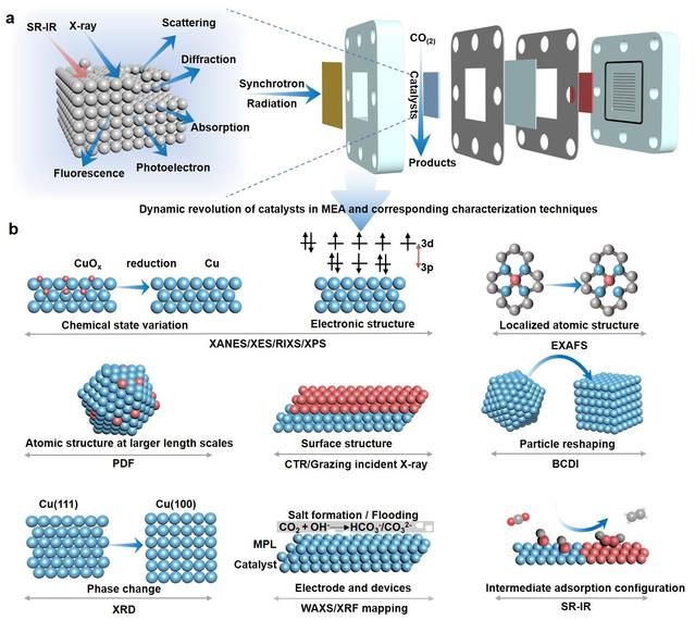 利用可再生电力将二氧化碳/一氧化碳(CO(2))转化为增值燃料展现出了巨大的吸引力。尽管在这方面已取得了显著的研究进展,但CO(2)电解体系在综合效率和稳定性方面仍面临重大挑战。在CO(2)RR过程中,电催化剂的化学组成、局域配位环境、晶体结构等通常会受到微环境和施加电位的影响,经历不可避免的动态结构变化;气体扩散电极(GDE)也面临由于电极击穿和盐析造成的稳定性挑战;膜电极(MEA)器件内的电子、离子传输也直接影响电极界面的微环境及相应的性能。鉴于CO(2)RR的性能和稳定性高度依赖于催化剂材料和反应器件,深入研究原位/工况条件下电催化剂材料的原子组态以及MEA器件内的动态演变规律,对深入理解CO(2)电解过程尤为重要。