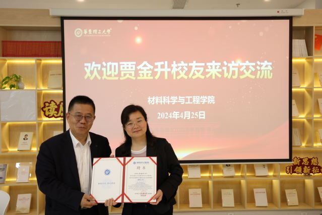 会上,袁媛为贾金升校友颁发无机非金属材料工程专业实习指导教师聘书。