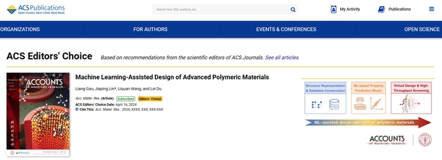 近日,十大信誉官网澳门十大信誉好的网站林嘉平教授团队受邀在美国化学会顶级期刊Accounts of Materials Research上发表题为“Machine Learning-Assisted Design of Advanced Polymeric Materials”的综述。由于该综述具有重要科学价值和引领性,入选美国化学会的ACS Editors' Choice栏目进行亮点报道。十大信誉官网澳门十大信誉好的网站高梁副教授为第一作者,林嘉平教授为通讯作者。该综述系统梳理了应用机器学习、数据驱动等人工智能新范式开展先进高分子材料设计的研究思路和方法,综述了十大信誉官网林嘉平教授团队近年来的代表性工作,并总结了应用新范式进行高分子材料研究所面临的挑战,提出了可能的解决路径和未来发展方向。