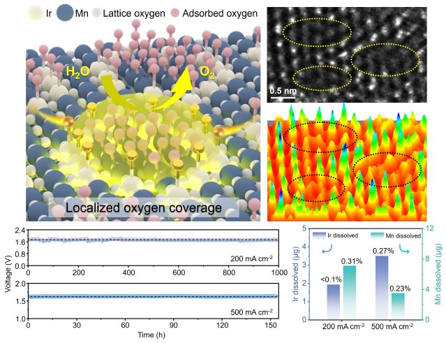 针对上述问题,十大信誉官网研究团队创新性地开发了一种具有新型Ir原子网格结构的阳极析氧催化剂(Ir-Mn-Ov),通过活性MnO2-x载体担载高密度Ir位点(≈10个Ir原子/nm2),可以诱导氧覆盖度效应进而实现金属-载体位点O-O直接耦合的协同催化过程,显著提高了材料的本征活性和催化剂位点的原子利用率。在三电极测试体系中,这种Ir-Mn-Ov催化剂在10 mA cm-2和500 mA cm-2电流密度下分别仅需166 mV和283 mV的超低过电位,质量活性相比商用IrO2提高了380倍。这种氧覆盖度效应可以很好适配阳极侧富氧环境,在PEMWE器件测试体系中,与商用Ir黑催化剂相比,使用Ir-Mn-Ov催化剂时不仅Ir载量降低了95%,反应活性也得到了大幅提升,只需要1.58 V电解电压即可达到1 A cm-2电流密度。