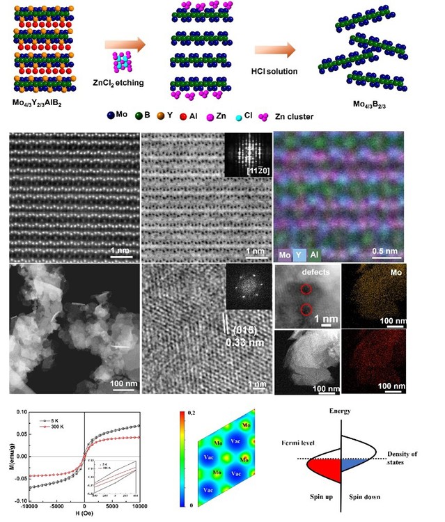 张良柱特聘副研究员通过缺陷工程策略合成了具有钼空位缺陷的Mo4/3B2 MBene 纳米片。通过路易斯酸刻蚀的方法制备Mo4/3B2纳米片实现了制备方法的无氟化。制备的Mo4/3B2纳米片横向尺寸为200 nm,厚度为 6.3 nm。其表现出两个重要的特性,纳米片粉体在环境温度下具有出色的稳定性而不氧化,以及在300K时饱和磁矩为 0.04 emu g-1的本征铁磁性。结合理论计算,铁磁性的起源归因于Mo4/3B2中的Mo空位缺陷,这些缺陷在费米表面附近产生大密度态,并自发自旋分裂带,导致最终导致系统的非零磁矩和自旋极化。MBene体系的磁性研究处于初期阶段,这种缺陷工程产生室温磁性的策略在Mo4/3B2纳米片中得到了验证。这将成为一种拓展MBene体系丰富物性的可靠方法,也将推进二维金属硼化物室温磁性在自旋电子学和磁性纳米载体上实际应用。