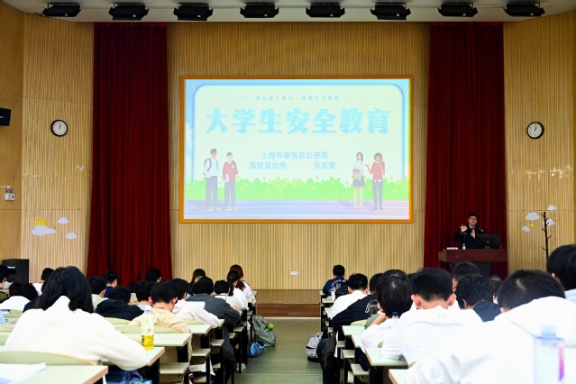 为提升大学生安全意识,普及安全知识,增强学生自我保护能力,4月8日下午,澳门十大信誉好的网站特别邀请上海市奉贤区公安局高校派出所张志荣警官,为学院2024级学生开展了一场主题为“安全护航·青春启航”的专题讲座。讲座在奉贤校区A200教室举行,学院300余名师生参与。