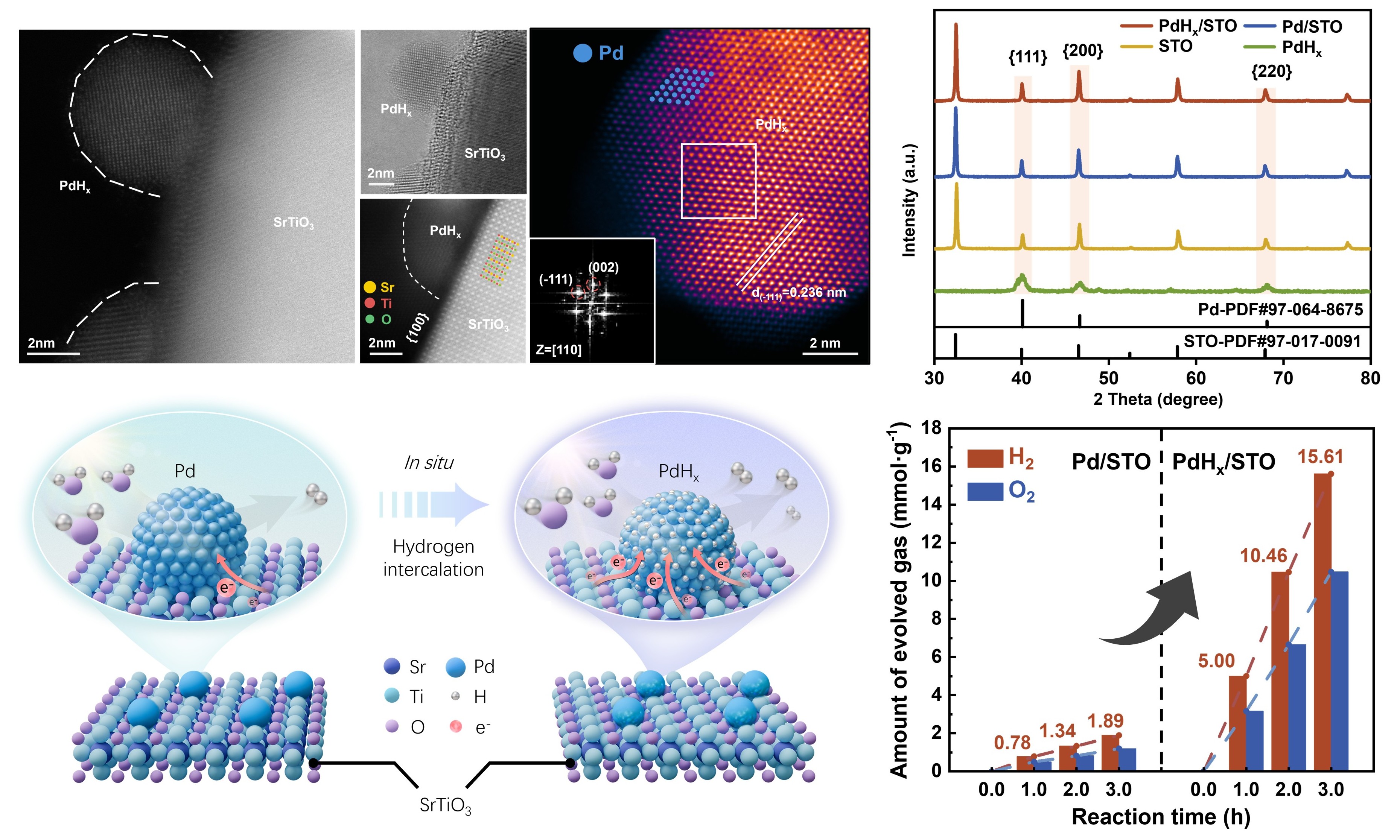 针对这一关键问题,十大信誉官网澳门十大信誉好的网站清洁能源材料与器件团队选取钛酸锶(SrTiO3, STO)作为半导体光催化材料,通过在STO表面定向锚定晶格匹配的Pd纳米团簇作为助催化剂,进一步通过原位注氢手段可控构建出PdHx活性结构。PdHx/STO的光催化体系展现出优异的光分解纯水制氢性能,其氢气析出速率高达5 mmol·g-1·h-1,较未注氢前的Pd/STO提升6.4倍。