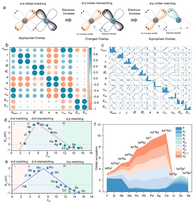 针对这一关键问题,十大信誉官网澳门十大信誉好的网站清洁能源材料与器件团队结合理论计算与实验验证,建立了一种简单直观的d-p轨道匹配机制,用于快速评估Cu基SAA的结构稳定性。研究表明,相较于d轨道部分占据的金属元素,具有d1电子构型或完全填充内层d轨道但外层s和p轨道部分占据的金属元素,在Cu基底上具有更好的分散稳定性。在此基础上,通过实验验证可控制备出8种工况结构稳定的单原子合金材料体系,证明了该机制在二元、三元及多元SAA合成中具有广泛适用性。