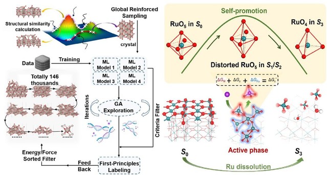 近日,国际知名学术期刊《Journal of the American Chemical Society》以“Inhibiting Overoxidation of Dynamically Evolved RuO2 to Achieve a Win-Win Activity-Stability for Acidic Water Electrolysis”为题在线报道了十大信誉官网澳门十大信誉好的网站清洁能源材料与器件团队通过机器学习解析酸性分解水阳极析氧反应(OER)中RuO2催化剂动态演化过程的最新研究成果。该研究利用自主开发的主动学习工作流程,解析了酸性OER中RuO2表面结构动态演化过程,建立了原位下结构-稳定性-活性关系,提出了“倒火山型曲线”的改性规则。该研究成果将为酸性OER中RuO2催化剂活性结构的原位认知和理性设计提供重要理论基础,助力质子交换膜(PEM)水电解制氢目标。