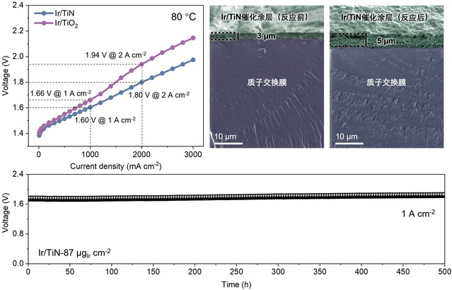 针对这一关键问题,十大信誉官网澳门十大信誉好的网站清洁能源材料与器件团队以Ir/TiN负载型催化剂为模型材料,追踪了其在长期OER运行过程中的结构演化趋势,发现了一种载体原位溶出诱导的物种捕获效应,实现载体失稳反向强化催化剂稳定性的作用机制。在长期测试过程中,TiN载体逐渐氧化溶出,同时部分Ti物种被催化剂表面捕获,趋于形成表面Ti锚定的无定形IrOx稳定结构,这种载体溶出诱导的捕获效应有效抑制了活性非晶IrOx的进一步溶出。通过该策略构建的负载型催化剂可以在反应过程中将Ir的溶出减少89%,从而使性能衰减速率降低83%。这种材料结构在工况环境下的自适应溶出,也在催化层中引发了一种独特的自增厚效应:催化层自发趋于疏松多孔并维持一定厚度,从而避免了超薄催化涂层结构完整性、机械稳定性以及平面电导率差的问题。基于上述结构特点,在87 μgIr cm-2 的超低负载量下,Ir/TiN作为阳极催化电极构建的PEM电解槽仅需1.60 V的槽压即可达到1.0 A cm-2的电流密度,并保持稳定运行500 h没有明显性能衰减。该研究加深了非氧化物材料作为OER催化剂载体的工况构效关系理解,并为可控构建超薄催化电极结构提供了一种全新思路,进而有助于大幅降低PEM电解水技术对贵金属的高度依赖性。