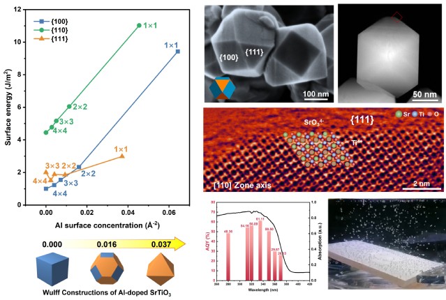 太阳能驱动的分解纯水制氢,被视为最具潜力的绿氢制取技术之一。光解水反应由光吸收、电荷分离和表面反应三个连续的过程组成,其中光生载流子的分离与传输作为连接光激发与表面催化反应的关键环节,面临着错综复杂的电荷迁移、传输、复合等多重路径,导致大量光生载流子在材料内部“迷路”复合,成为限制光解水反应效率的核心瓶颈。研究人员发现,具有各向异性晶面的单晶半导体如同构建了“电荷立交桥”,不同取向的晶面具备独特的电荷特性,可驱动电子与空穴分别驶向专属晶面,这种空间分离特性不仅能大幅降低电荷复合概率,更实现了氧化还原反应的分区进行,为突破效率瓶颈提供了一种有效的解决方案。然而,传统高温固相合成难以精确控制单晶材料的晶面结构,导致电荷传输通道受阻。在近期的研究结果中,研究团队通过熔盐辅助固相合成方法,揭示了微量Al3+掺杂对钛酸锶(SrTiO3)单晶{111}晶面结构的调控作用(J. Am. Chem. Soc. 2024, 146, 6618),进而构建出高效的各向异性晶面结构。尽管如此,对于Al3+调控SrTiO3单晶表面结构的深层机制仍然缺乏系统的理解。