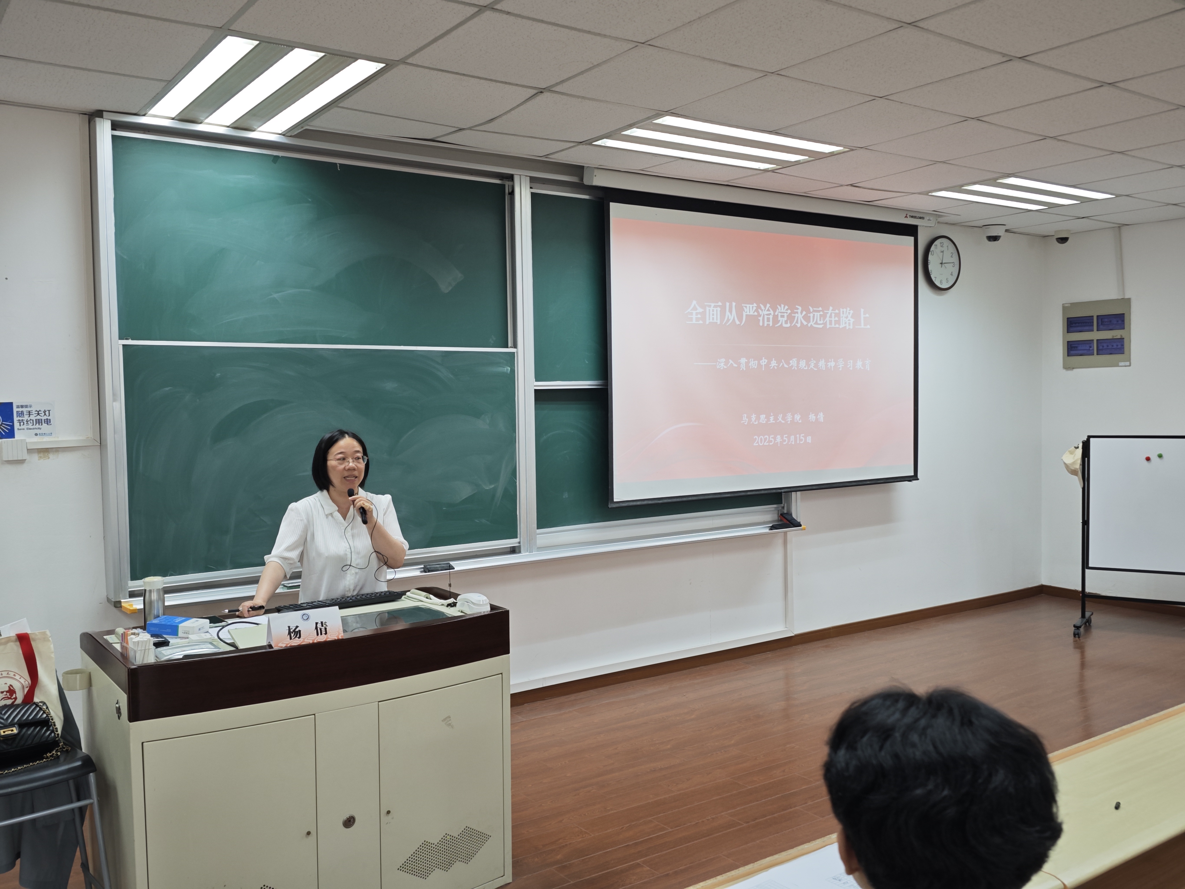 杨倩系统梳理了党的作风建设的历次学习教育活动,深入剖析了反腐败典型案例,阐释了中央八项规定精神的核心要义,强调同学们要弘扬自我革命精神,坚持党的领导,维护党中央权威和集中统一领导,用习近平新时代中国特色社会主义思想武装头脑,以实际行动争取早日加入中国共产党,投身于共产主义事业