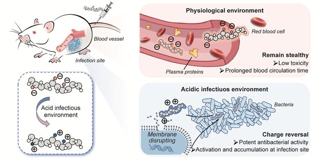 耐药阴性菌感染死亡率高,且近50年来未有新类别抗生素问世,因此亟需开发新型抗菌药物应对这一全球公共卫生威胁。宿主防御肽(HDPs)及其模拟物因其不易诱导微生物产生耐药性的优点,被视为极具前景的抗耐药菌感染候选药物,但在体内环境中可能会与宿主细胞和血清蛋白等发生非特异性相互作用,进而引发溶血毒性和血液循环时间短等问题。因此,设计兼具高效体内活性和良好生物相容性的HDP模拟抗菌化合物,对于耐药细菌感染治疗具有重要意义。