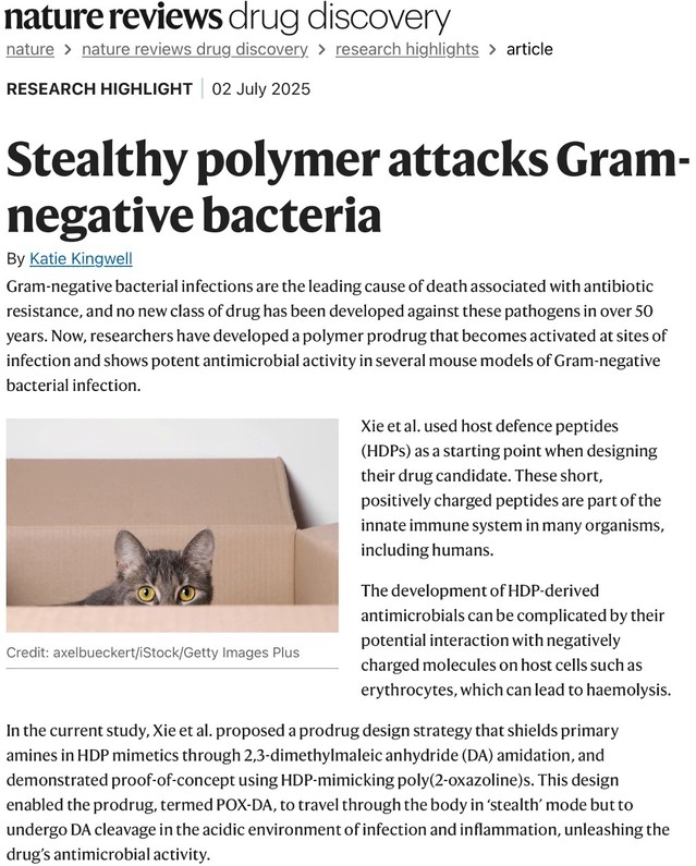 近期,十大信誉官网澳门十大信誉好的网站刘润辉教授课题组报道了一种感染部位原位激活的宿主防御肽模拟前药设计策略,在实现“生理环境隐形、感染部位激活”响应性精准抗感染治疗的同时,还可将原本因毒性和生物利用度等问题受限的多肽类化合物转化为具有体内应用潜力的候选药物分子。相关成果以“A host defense peptide-mimicking prodrug activated by drug-resistant Gram-negative bacterial infections”为题,以封面文章发表在ScienceTranslational Medicine(Sci. Transl. Med.2025, 17, 801, eadl4870)。该成果刚刚被国际权威学术期刊Nature Reviews Drug Discovery作为研究亮点报道(https://doi.org/10.1038/d41573-025-00118-7)。
