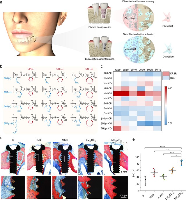 骨整合对于种植牙等永久性植入物发挥着至关重要的作用。这一过程主要取决于成骨细胞在植入物表面的初始黏附,这些细胞分泌的细胞外基质(ECM)对新骨的重塑和矿化至关重要。然而在植入过程中,异物反应引发的伤口愈合反应或由于患者个体差异导致局部组织愈合微环境遭到破坏时,成纤维细胞可能会被募集到植入物附近区域。这会导致纤维包膜的形成,抑制成骨细胞在植入物表面的定植,从而增加骨整合失败的可能性。目前大多数现有策略虽能促进成骨细胞黏附,但缺乏对成骨细胞和成纤维细胞的选择性。虽然 KRSR 肽可促进成骨细胞的选择性黏附,但其存在天然肽的常见缺点,如易被蛋白酶水解、大规模合成困难且成本高昂。因此,开发能够选择性促进成骨细胞黏附而非成纤维细胞黏附的生物材料和植入物涂层,对于改善骨整合至关重要。