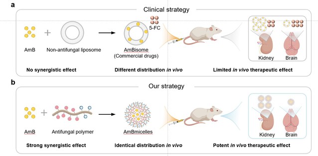 随着真菌耐药性日益增强,单一真菌药物治疗方案疗效往往不佳甚至失败。两种具有协同作用的药物组合,往往表现出比单一药物更高的疗效,尤其在耐药和难治的感染性疾病中表现出强大的潜力。尽管如此,真菌系统性感染尤其是脑膜炎,在临床上依然显示高死亡率。重要的原因在于抗真菌药物种类少导致协同药物组合数量非常有限,且两种药物不同的药代动力学和体内分布导致其很难在感染部位以协同比例分布,难以实现体外的协同效果。因此急需可以实现体内真实协同治疗耐药真菌感染的有效策略。