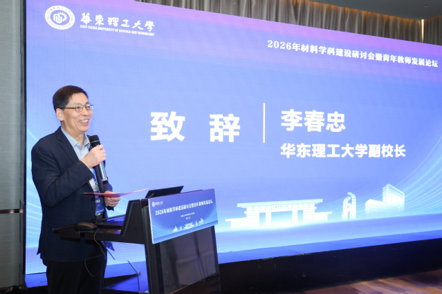 李春忠在致辞中指出,本次论坛聚焦材料学科前沿与未来走向,旨在共商学科建设思路、共谋创新发展良策。华东理工大学始终围绕国家重大战略需求,持续优化学科布局,深耕基础研究与应用开发,致力于破解关键领域技术瓶颈。期待与各兄弟院校及科研院所深化交流、优势互补、协同攻关,催生更多原创成果,助力青年教师成长,推动教育、科技、人才一体化融合发展,以材料创新赋能强国建设。